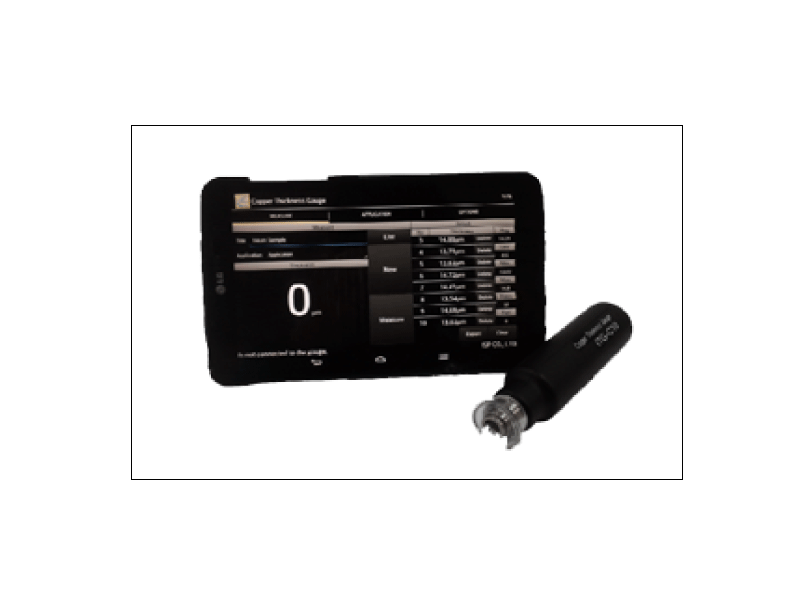 - Đặt máy dò (thiết bị đo) thẳng đứng trên mẫu mạ đồng trong 1-2 giây, và màn hình máy tính bảng (máy phân tích, thiết bị nhận) hiển thị dữ liệu độ dày.